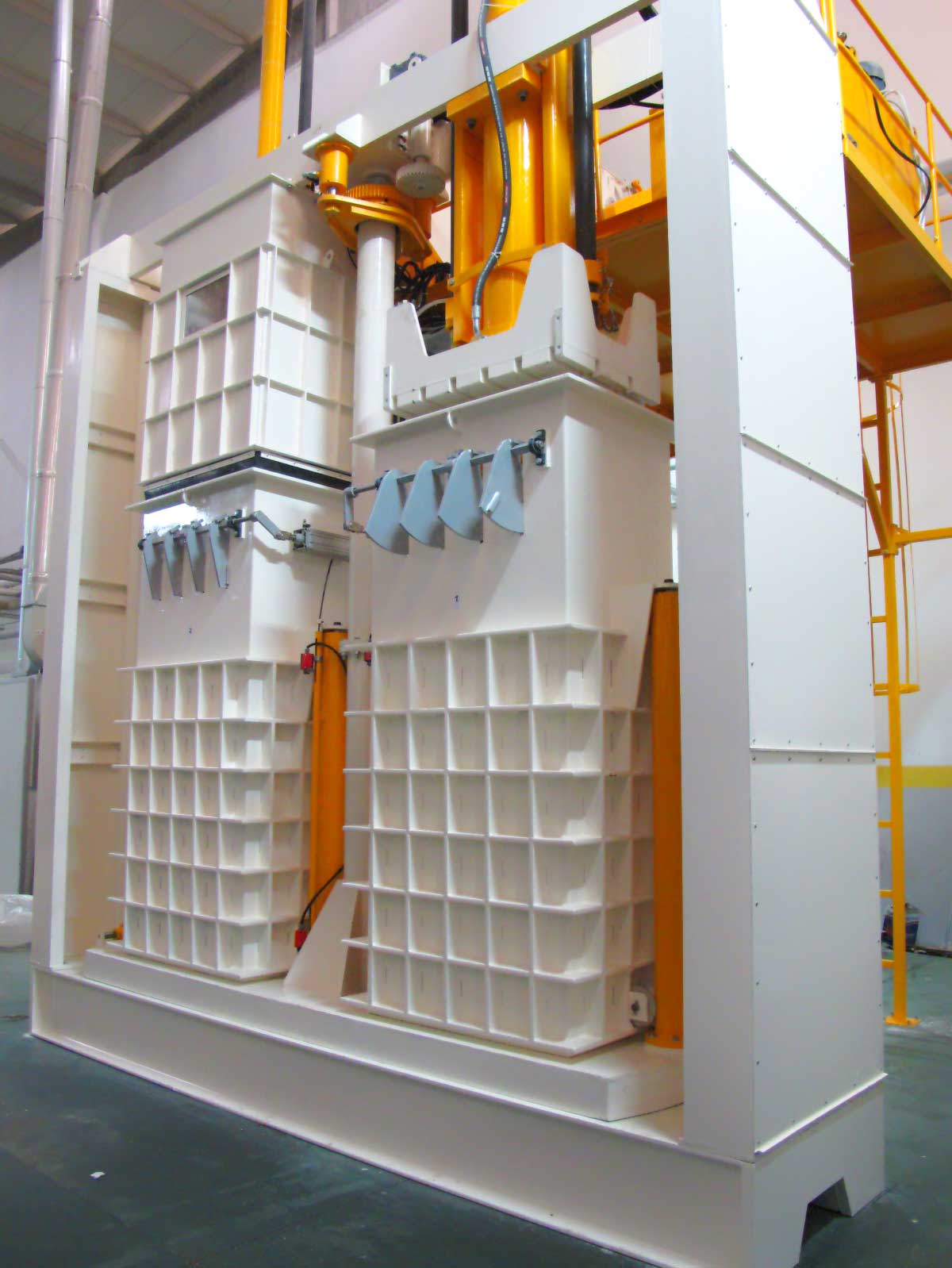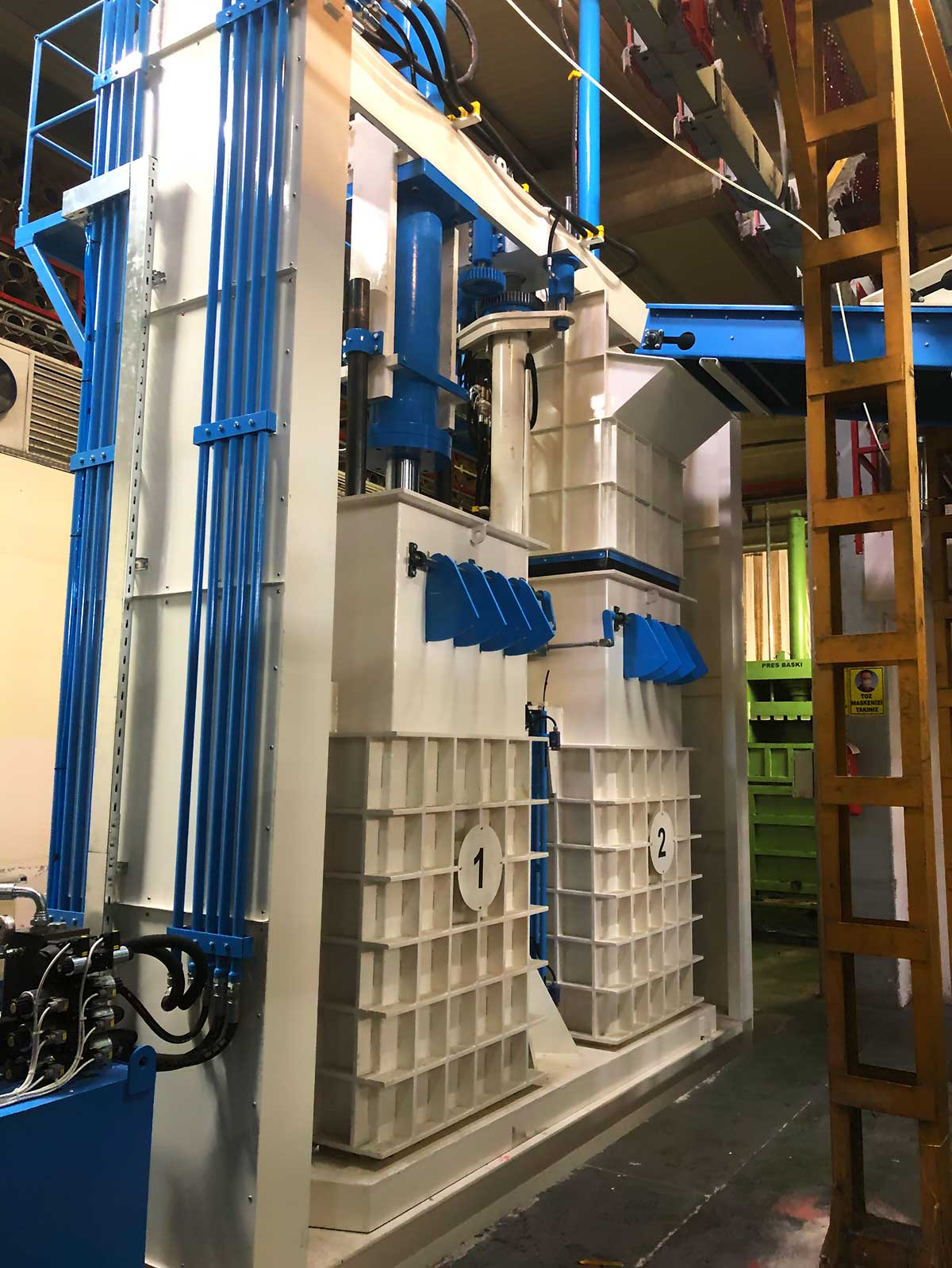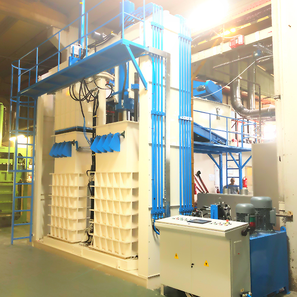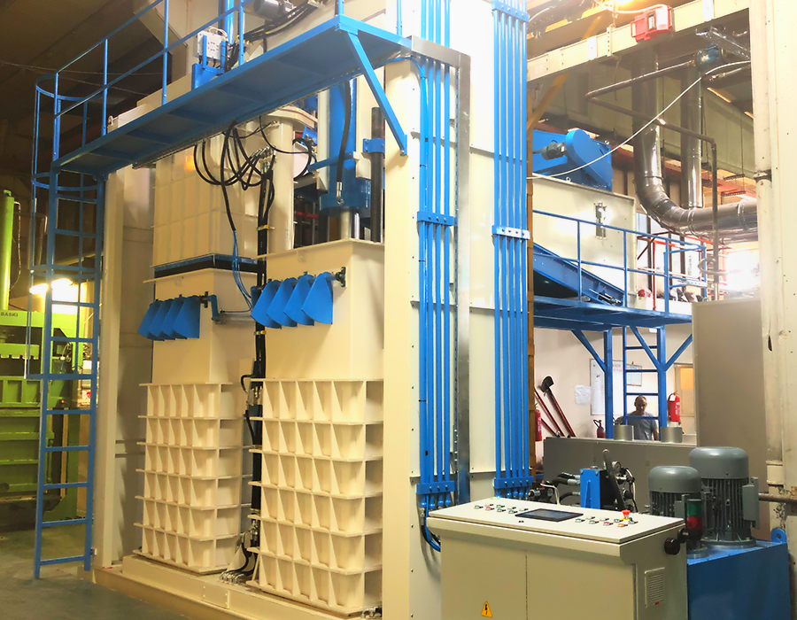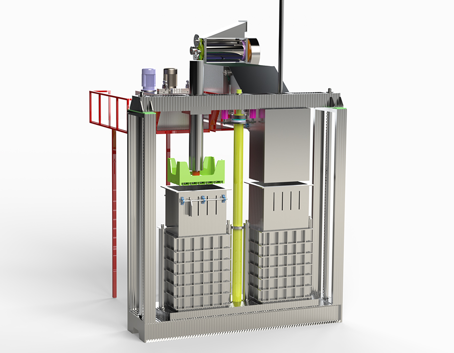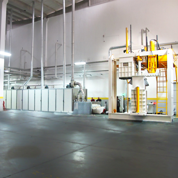 Он специально разработан для таких продуктов, как волокно, шерсть, хлопок и т.д., и имеет 2 камеры. В то время как в одной из камер выполняется процесс прессования, в другой - процесс наполнения. Когда процесс наполнения завершен, усилие Sram: 80-200 т убирается, и процесс прессования повторяется. Он оснащен полностью автоматической системой, управляемой ПЛК. Это позволяет экономить время и рабочую нагрузку. Он работает в комплексе с сошником (EM10), ленточной сушилкой (EM01) и системой перекачки конденсатора (EM11)