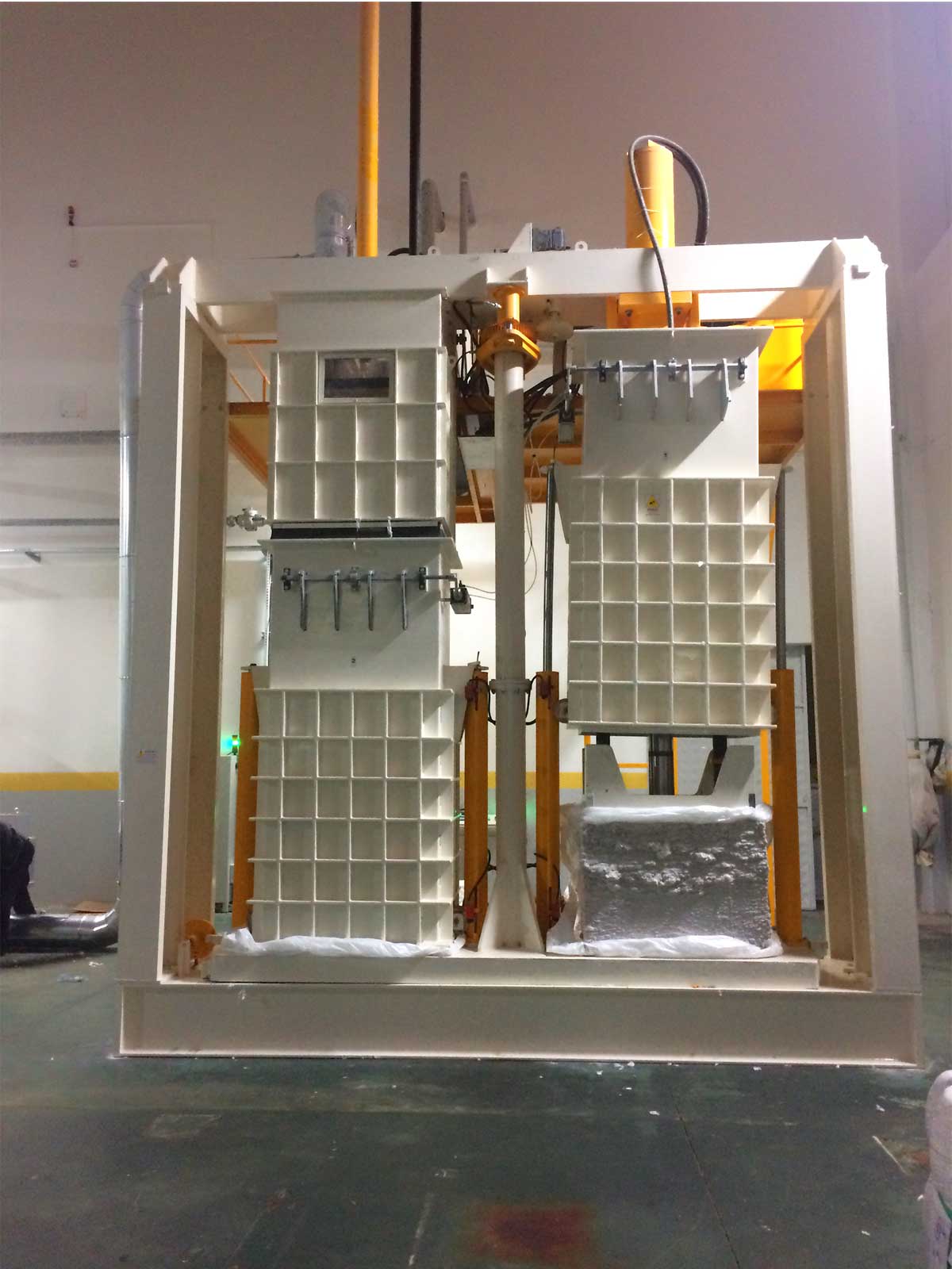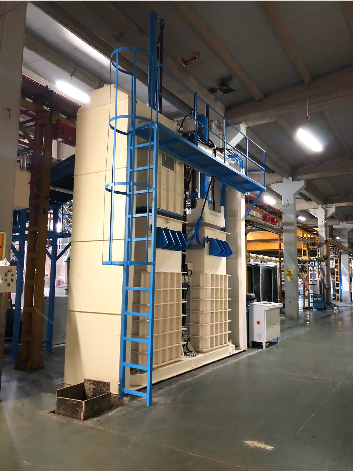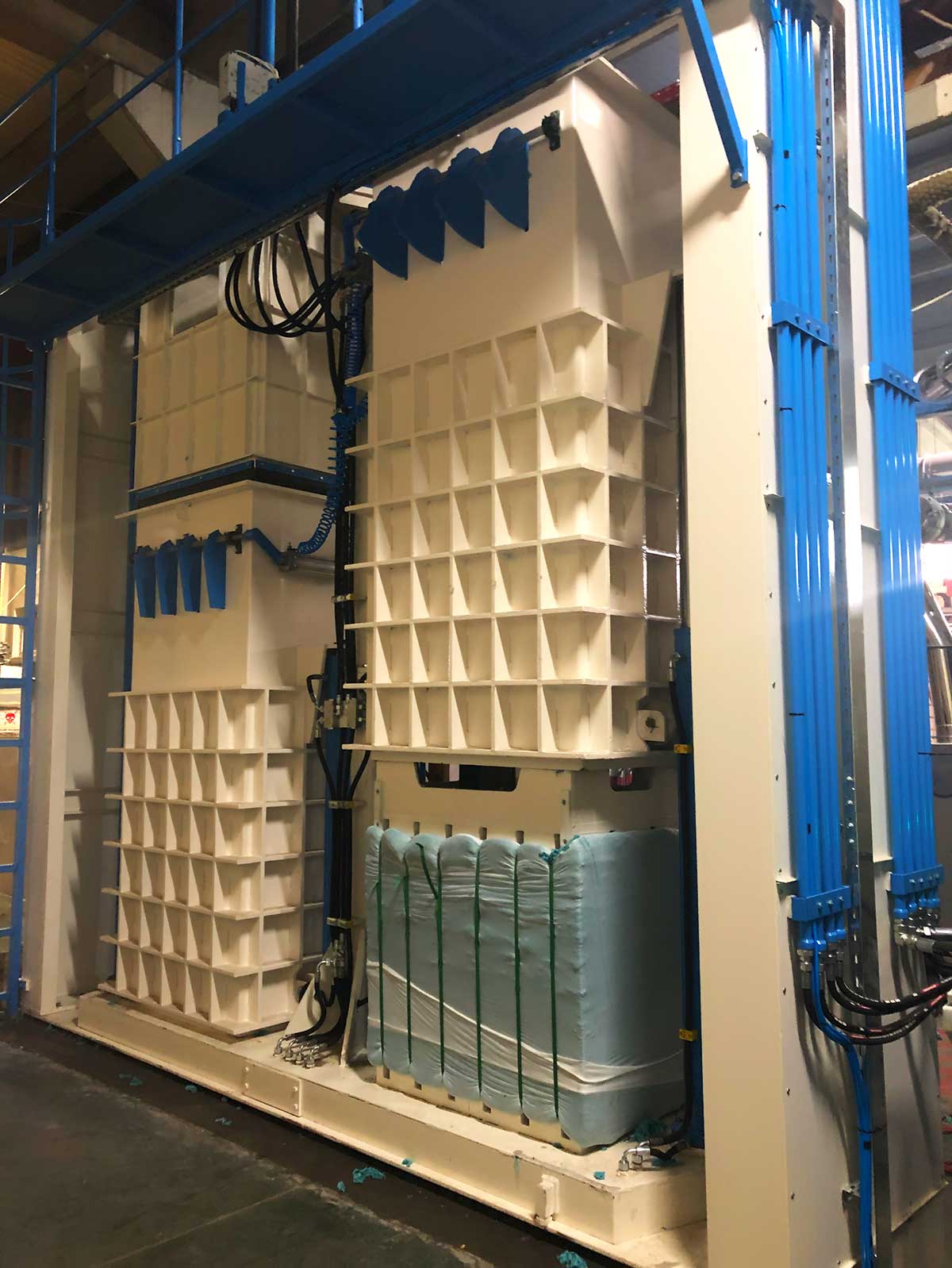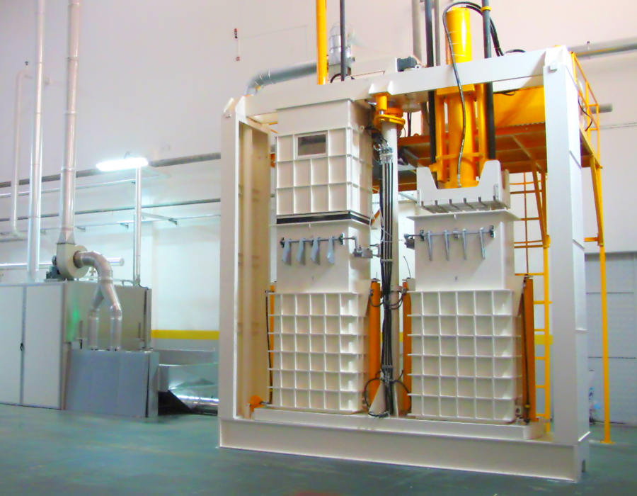Он специально разработан для таких продуктов, как волокно, шерсть, хлопок и т.д., и имеет 2 камеры. В то время как в одной из камер выполняется процесс прессования, в другой - процесс наполнения. Когда процесс наполнения завершен, усилие Sram: 80-200 т убирается, и процесс прессования повторяется. Он оснащен полностью автоматической системой, управляемой ПЛК. Это позволяет экономить время и рабочую нагрузку. Он работает в комплексе с сошником (EM10), ленточной сушилкой (EM01) и системой перекачки конденсатора (EM11)